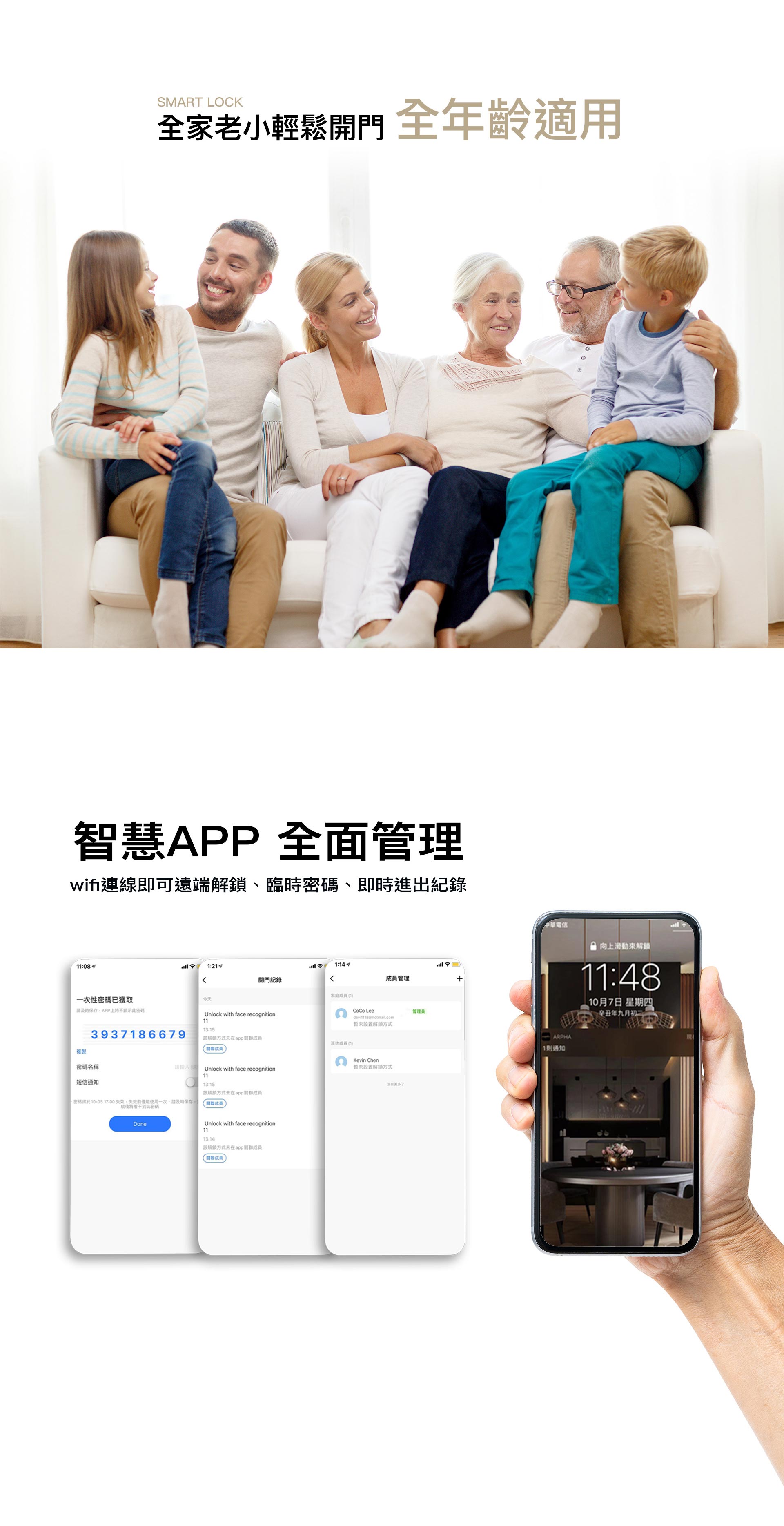 連接wifi可以使用APP : 遠端解鎖、臨時密碼、即時進出紀錄查看